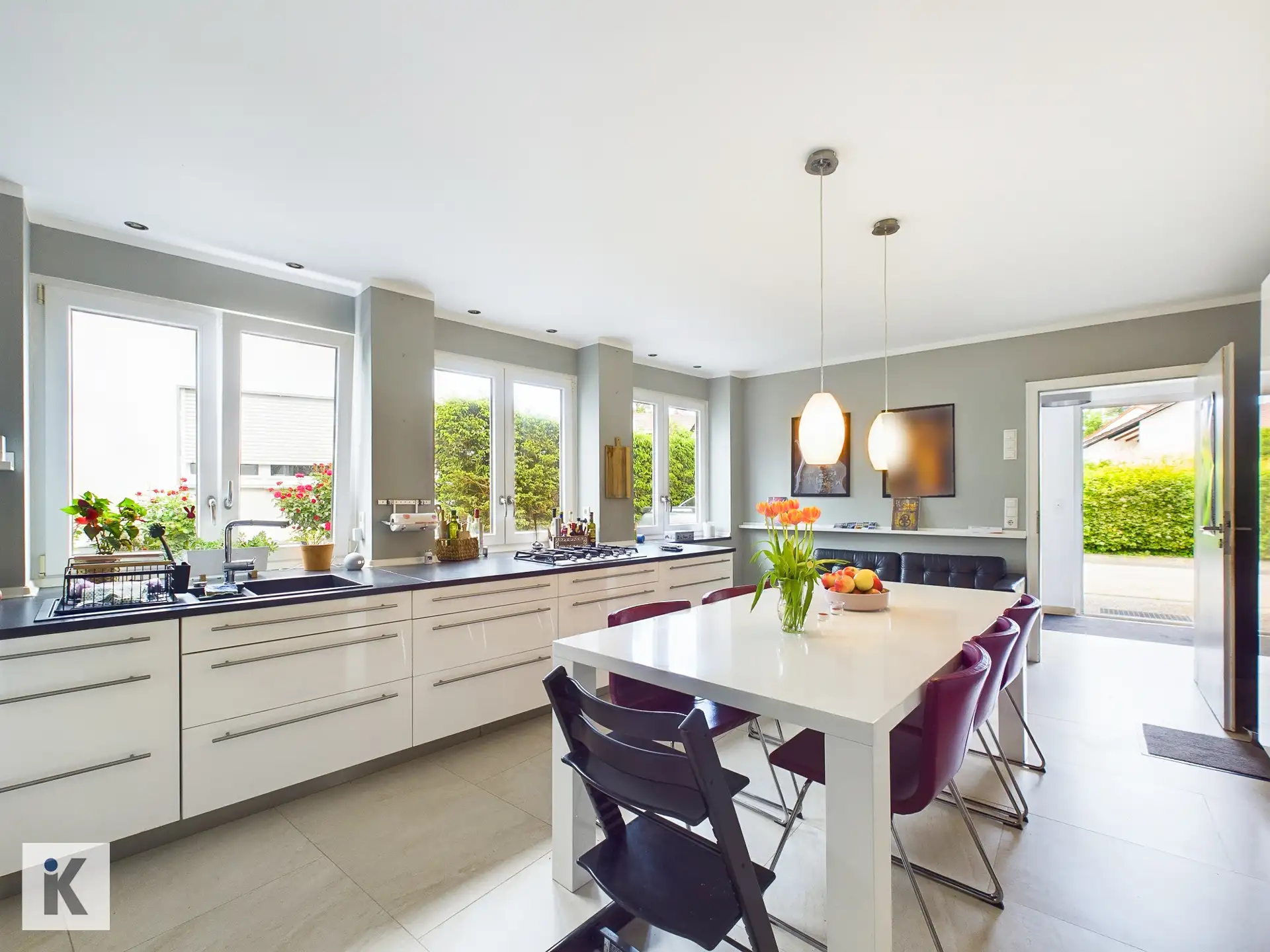 Geradeaus erreichen Sie die geräumige Familienküche, die zu geselligen Stunden einlädt und auch Platz zum Essen bietet. Von der Küche aus geht es über ein paar Stufen ins Gartengeschoss.