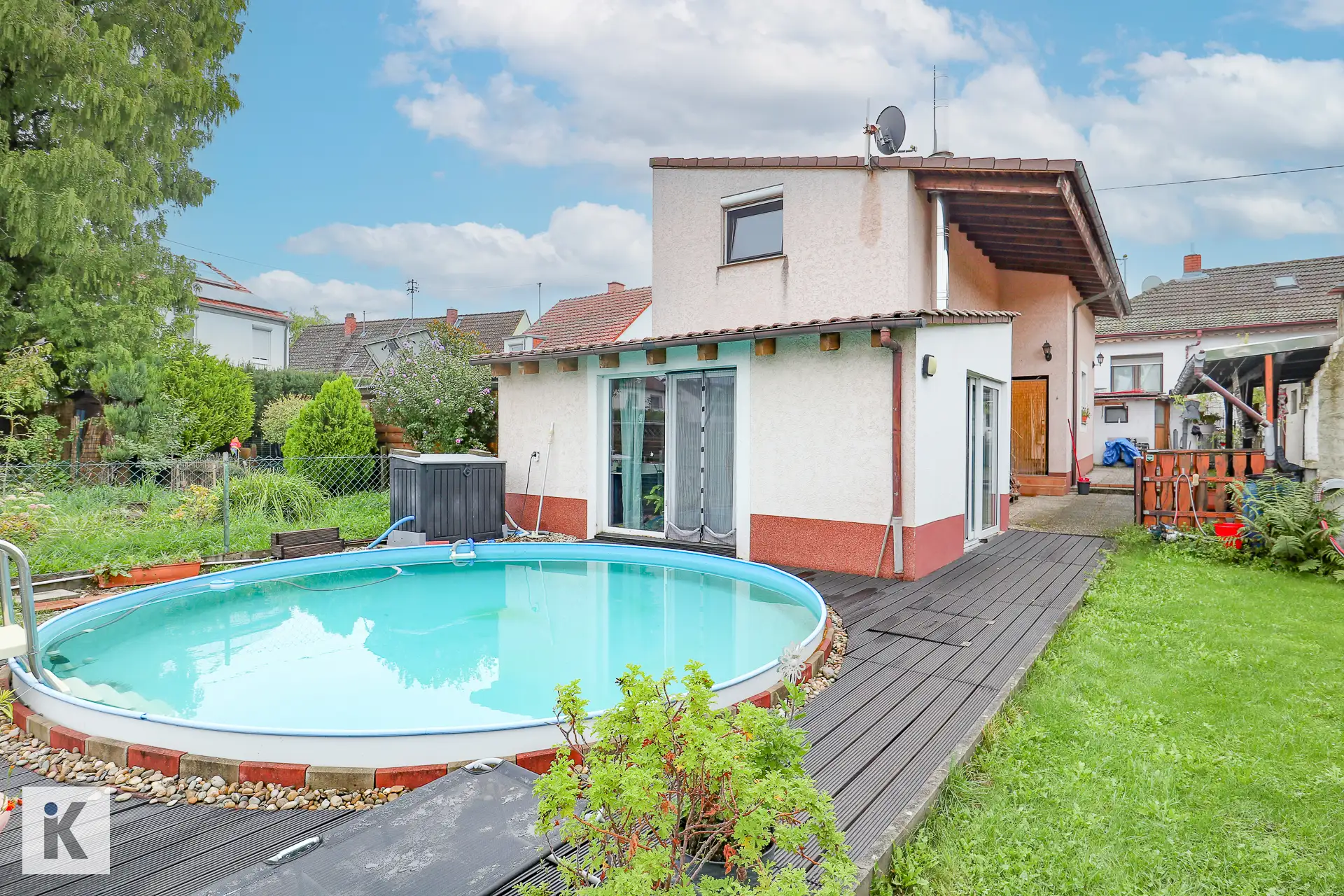 Der Garten ist eine wahre Oase der Entspannung und Freizeitgestaltung. Ein großer Pool mit einem Durchmesser von 5 Metern und einer Tiefe von 1,50 Metern lädt an warmen Tagen zum Erfrischen ein. Die Terrasse ist überdacht und hat einen rustikalen, von den derzeitigen Bewohnern selbst gemauerten Grill.